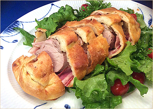 (4)つなぎ目を下にして、5~10分休ませたら、塗り卵をして、200℃で20分焼き、オーブンから出してアルミ箔で包み、20分休ませ、落ち着いたら切り分ける。